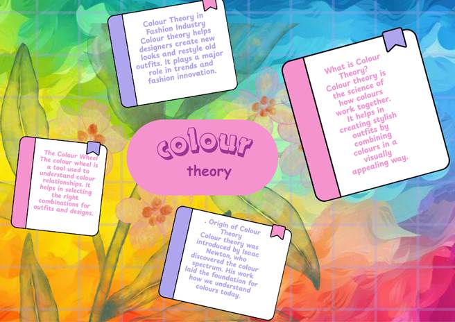 Colour theory explains how colours work on clothes. It is often represented using a colour circle. While it does not completely depend on a circular shape, the colour wheel helps in choosing fashion combinations. It focuses on the use of bright and dark colours and how they can be mixed together.